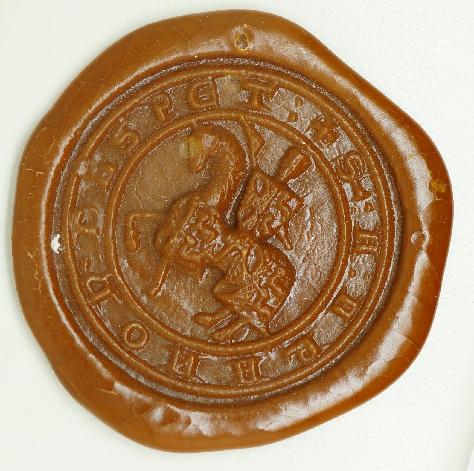 Eth sagèth de Raimond-Arnaud Ièr de Coarrasa qu’ei junt a ua quitança datada deth 15 d’octobre de 140617. Que presenta eras navèras armas de Raimond-Arnaud coma senhor d’Aspèth. De hèt, que presenta un escartairat deth aneret (o mèslèu era ròda de molin?) dera familha de Coarrasa18 e deth miei-partit de Comenge e d’Aspèth, estudiat aciu-devant.