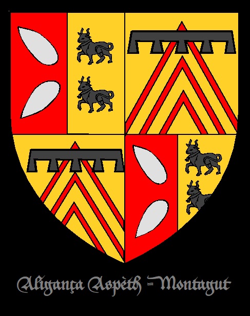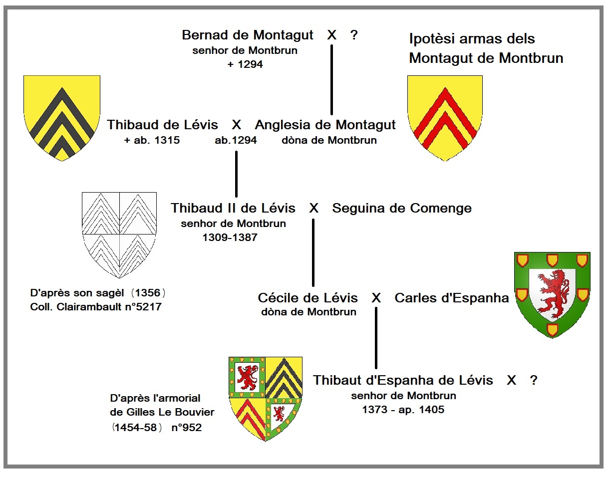 S’eths dus quartièrs aras armas deths Comenge d’Aspèth hèn pas cap de dobte, era identificacion deths quartièrs 2 e 3 coma armas deths Montagut de Coserans que demòra ipotetica. Era nòsta ipotèsi que s’apieja sus era analisi deth escut de Tibaut d’Espanha de Levís, arrèr-petit-hilh d’Anglesia de Montagut, dama de Montbrun e eretèra de Bernat de Montagut, darrèr representant mascle dera sua maison. Eras armas de Tibaut que son conegudas gracias ath armoriau de Gilles Le Bouvier. Qu’arrepresentan un escartairat on arreconeguem eras armas pairalas d’Espanha-Montespan e mairalas de Levís, mès eth tresau quartièr « d’aur a dos cabirons de vermelh » que sembla eretat tot dret deths Montagut de Montbrun, coma avem ensajat d’arrepresentà’u sus aqueste tablèu genealogic.