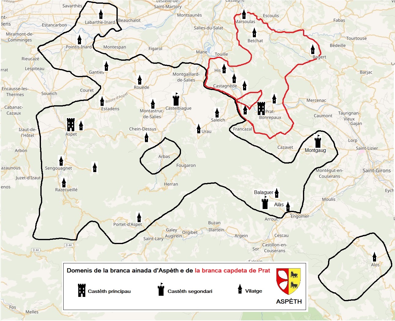 - Segon Higounet (op. cit.), era senhoria que s’espandia peras localitats d’Aspèth (dambe Milhars, Senguanhet e Reculhèr (Millas, Sengouagnet, Razecueillé, 31) que’n horen destacats en 1836) , Castèthviague (Castelbiague, 31), Shenh Damont (Chein-Dessus, 31), Escat(Cna d’Aspèth), Estadenh (Estadens, 31), Gantias (Ganties, 31), Era Barta d’Inard (Labarthe-Inard, 31), Mauvedin (Mauvezin-de-Prat, 09), Montastruc (Montastruc-de-Salies, 31), Poentis d’Inard (Pointis-Inard, 31) en partida, Arrueda (Rouède, 31) e Saleish (Saleich, 31) en Comenge mès tanben peths vilatges d’Alòs (Alos, 09), Montgaug (Montgauch, 09), Portèth d’Aspèth (Portet-d’Aspet, 31) e era vath de Balaguèras dambe Alàs, Balaguèr e Eth Vinhau d’Engomèr, en Conserans. Era senhoria d’Arbas (Arbas, 31), que dependia d’un priorat deth convent fontevrista de Longatges (Longages, 31) que hoc crompada en 1311 per Rogièr e Raimond-At d’Aspèth e Azemar de Mauleon.